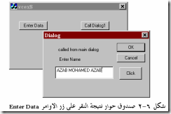 والشكل6-2 يحتوى على أداة كتابة أكتب بها اسمك ثم انقر على زر الاوامر Click تظهر رسالة ترحيب ،كما يوجدعلى الشاشه الرئيسيه زر أوامر مكتوب عليه Call Dialog1 عند الضغط عليه يظهر صندوق حوار آخر كما فى شكل 6-3